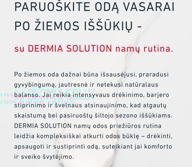 Blog post dePo žiemos oda dažnai būna išsausėjusi, praradusi gyvybingumą, jautresnė ir netekusi natūralaus balanso. Jai reikia intensyvaus drėkinimo, barjero stiprinimo ir švelnaus atsinaujinimo, kad atgautų skaistumą bei pasiruoštų šiltojo sezono iššūkiams.scription.