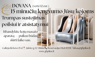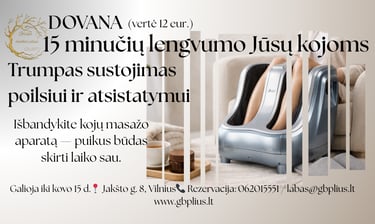 Norint pasinaudoti procedūra ar kojų masažo aparatu, būtina iš anksto registruotis telefonu +370 620 15551 arba el. paštu labas@gbplius.lt.